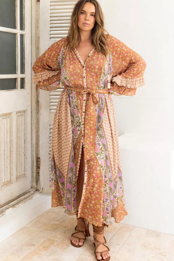 Our Sienna Gown In Clay Is A Feast For The Eyes. Dazzling With A Subtle Metallic Shimmer Throughout, Our Gown Captures Attention – A Beguiling Combination Of Romance, Exquisite Detail And Euphoric Colour. Three Distinct Hand Drawn Prints In Burnt Orange, Gold, Lilac And Pink Are Spliced Together To Create This Piece Of Wearable Art. Our Gown Includes Tassels At The Neck Finished With The Cutest Brass Bells And An Included Waist Tie For Styling Opportunities. A Button Down Front Allows For This One To Be Worn Open As A Duster Over A Simple Tank And Denim. We Imagine This One Worn With Chunky Sandals And A Beaded Shoulder Bag For Market Mornings Or For Strolling Cobbled Streets In Far Off Lands. – Crafted With 49% Organic Cotton, 48% Lenzing™ Ecovero™ Viscose And 3% Metallic- Button Down Front- Detachable Tie