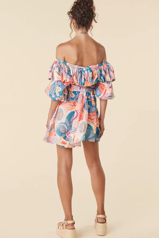 An Incredibly Special Piece, The Akirra Koo Mini Dress In Bay Blue Is Unique Featuring A Hand Painted Watercolour Artwork From First Nations Artist – Kylie Caldwell. This Mini Commands Attention With Dramatic Puff Sleeves And A Plunging Neckline With A Feminine Frill. Each Mini Features An Original Print Placement, Making No Two Dresses The Same. An Endlessly Versatile Style, This One Can Be Worn On Or Off Shoulder, With Or Without The Detachable Tie And Styled For An Elevated Moment Or Casual Setting. Crafted In A Gorgeously Light And 100% Linen And Unlined, This Style Is Perfect For Summer And Easy To Layer Through The Cooler Months. We Recommend Styling This One With Thigh High Boots And The Matching Tie In Your Hair For A Festival Fit Or With Sandals And A Woven Bag For Brunch With The Girls. – Crafted With 100% Linen – Unlined Through The Body / Lined Through The Sleeves For Extra Drama – Detachable Matching Wide Waist Tie