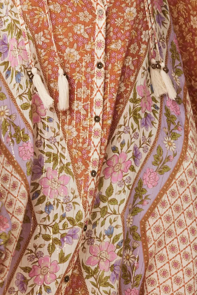 Our Sienna Gown In Clay Is A Feast For The Eyes. Dazzling With A Subtle Metallic Shimmer Throughout, Our Gown Captures Attention – A Beguiling Combination Of Romance, Exquisite Detail And Euphoric Colour. Three Distinct Hand Drawn Prints In Burnt Orange, Gold, Lilac And Pink Are Spliced Together To Create This Piece Of Wearable Art. Our Gown Includes Tassels At The Neck Finished With The Cutest Brass Bells And An Included Waist Tie For Styling Opportunities. A Button Down Front Allows For This One To Be Worn Open As A Duster Over A Simple Tank And Denim. We Imagine This One Worn With Chunky Sandals And A Beaded Shoulder Bag For Market Mornings Or For Strolling Cobbled Streets In Far Off Lands. – Crafted With 49% Organic Cotton, 48% Lenzing™ Ecovero™ Viscose And 3% Metallic- Button Down Front- Detachable Tie