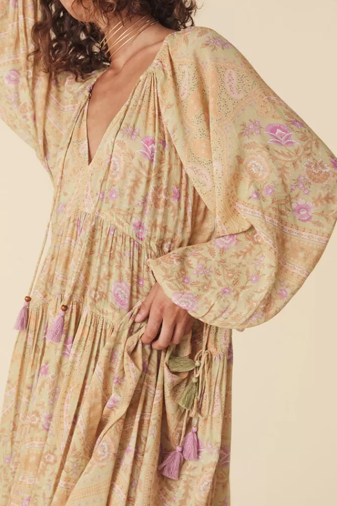 Our Belladonna Gown In Dusty Olive Is Designed With Our Unruly, Goddess Like Muse In Mind. Effortlessly Elegant In Stunning Dusty Golds And Greens, Our Newest Gown Features An Adjustable Elasticated Neck With Delicate Tassels And A Frill. This One Includes Two Waist Ties Finished With The Sweetest Two Tone Tassels, Completely Adjustable For Your Preferred Silhouette. We Imagine This One Worn With Tan Mules And Fine Jewelry For Some Dreamy Goddess Glam Or With Combat Boots And A Jacket For An Edgy Twist. – Crafted With 50% Lenzing™ Ecovero™ Viscose And 50% Organic Cotton- Unlined For Easy Wear- Elastic Neck And Sleeve Cuffs