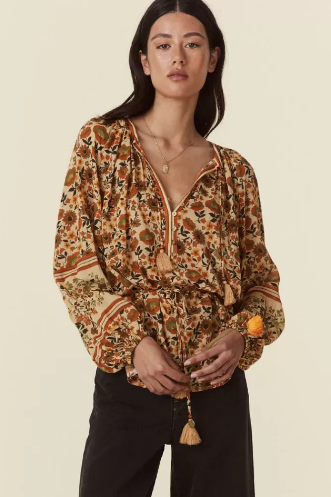 The Impala Lily Tie Blouse In Gold Is Crafted For The Rebel Hearts. This Blouse Is A Daring Take On The Beloved Dolly Blouse, Enriched With Intricate New Details That Speak To The Untamed Spirit. Crafted With A Voluminous Silhouette In A Dreamy Floaty Fabrication, This Blouse Is A True Statement Piece. The Stunning V Neckline Is Adorned With Fabric-Covered Buttons, Offering Styling Versatility. The Neck Ties Feature Eye-Catching Pink Tassels And Custom Charms, Adding An Element Of Bohemian Allure To Your Ensemble. A Waist Tie And Belt Loops Offer Further Styling Options. Pair It With Your Favourite Denim And Sneakers For Some Everyday Glamour Or Elevate Your Look By Teaming It With A Lace Skirt And Strappy Sandals For Brunch With The Girls. – Crafted With 50% Organic Cotton And 50% Lenzing™ Ecovero™ Viscose – Tie Waist