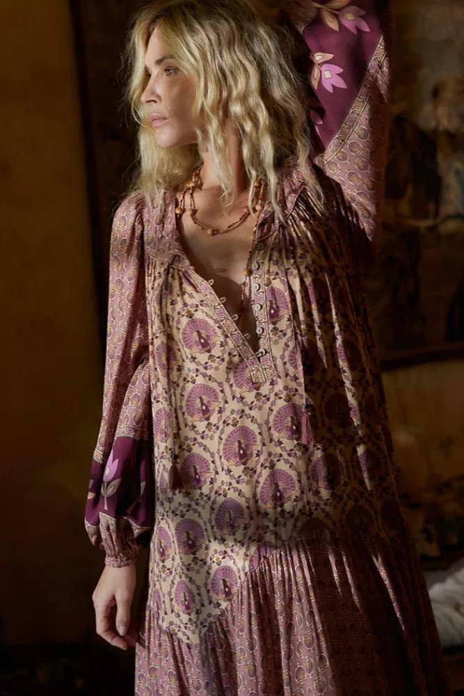 The Château Boho Gown In Grape Is Crafted For The Wild And Wanderlust. Arriving In Dreamy Hues Of Deep Purple, Smokey Pinks And Honeyed Amber Our Gown Is A Visual Masterpiece. Our Gown Features A Quilted Yoke, Neck Ties With Tassels And Custom Beads, A Captivating Curved Tier Detail And A Detachable Tie Belt For Styling Versatility. Awaken Your Inner Goddess In Our Newest Boho Gown With Fine Jewels And A Tan Mule For That Dinner By Candlelight At The Château. – Crafted With 70% Lenzing™ Ecovero™ Viscose 30% Refibra Lyocell- Unlined For Easy Wear – Coconut Button Down Front