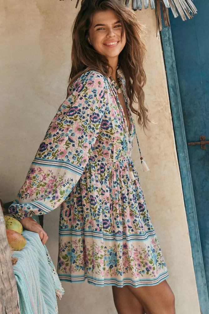 The Impala Lily Mini Dress In Iris Is Charming And Sophisticated, Made For Romantic Hearts. This Mini Features A Curved Front Waist, Adding A Flattering And Feminine Touch To The Silhouette. Custom Charms And Beads Adorn The Neck Tassels, A Striking Border Print At The Sleeve And Skirt Hem Offer Intrigue, Elevating The Look. Designed As An Easy Throw On Style, We Recommend Pairing This One With Sandals And A Woven Basket For Market Mornings Or With A Chunky Boot And Jacket For A ‘Cool Girl’ Approach. – Crafted With 50% Organic Cotton And 50% Lenzing™ Ecovero™ Viscose – Lined