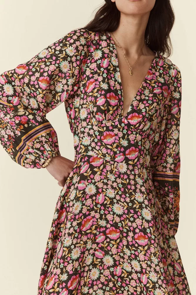 Meet The Mesmerising Impala Lily Gown In Night Blossom ~ A Masterpiece That Seamlessly Weaves Together Sophistication And Elegance, Adorned With Captivating Hand-Drawn Floral Motifs And Pops Of Vibrant Color Against A Dark Base. Crafted From Luxurious Linen Our Gown Is Captivating, A Structural Marvel Designed To Embrace Your Every Move With Grace. The Striking Plunging V-Shaped Neckline, Mirrored By A Deep V At The Back, Exudes An Air Of Mystery And Charm, While The Shaped Waist And Shirred Back Add A Touch Of Feminine Allure To Enhance Your Curves.We Imagine This One Paired With Vintage Clogs For Some Timeless Glamour Or Lace Up Boots And A Tassel Bag To Complete Your Festival Fit. – Crafted With 100% Linen- Lined- Shirred Back Waist