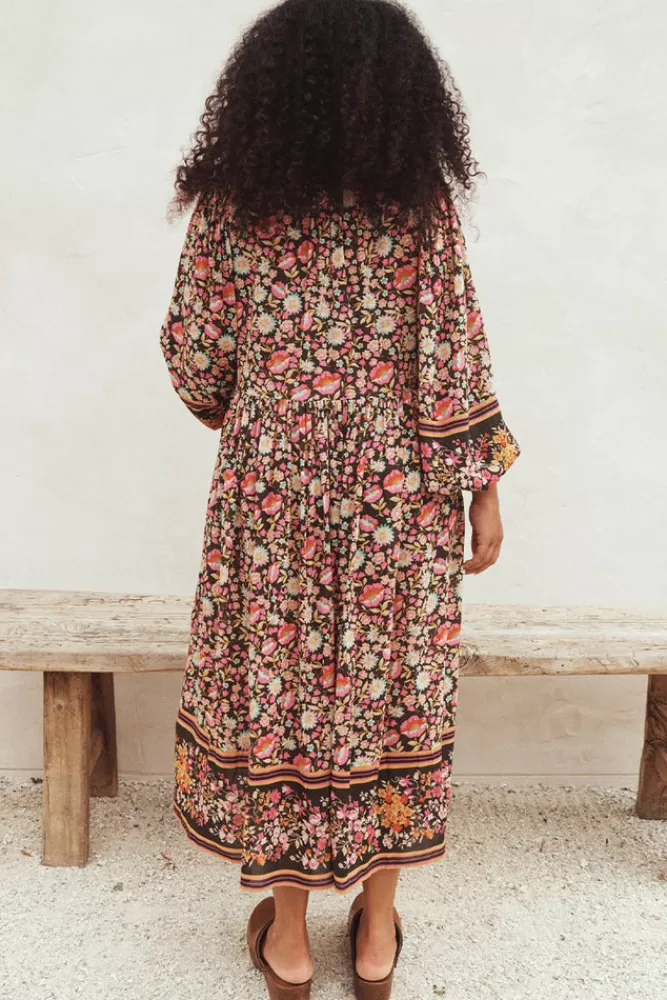 The Impala Lily Boho Midi Dress In Night Blossom Is Effortless And Embraces Individuality With A Bohemian Twist. Our Newest Boho Is Striking With Intricate Border Print Details At The Sleeve And Skirt Hem, A Flattering Curved Front Waist And Bright Pink Tassels Adorned With A Custom Charm And Wooden Beads. In Usual Spell Style, Our Boho Turns Every Step Into A Graceful Dance Of Hues.Whether You'Re Exploring A Festival Hand In Hand With Your Bestie In Boots And A Chunky Belt Or Wandering An Artisan Market With Sandals And Woven Basket, Let Your Individuality Shine Brightly With This Enchanting Piece. – Crafted From A Blend Of 50% Organic Cotton And 50% Lenzing™ Ecovero™ Viscose – Lined At Front Yoke