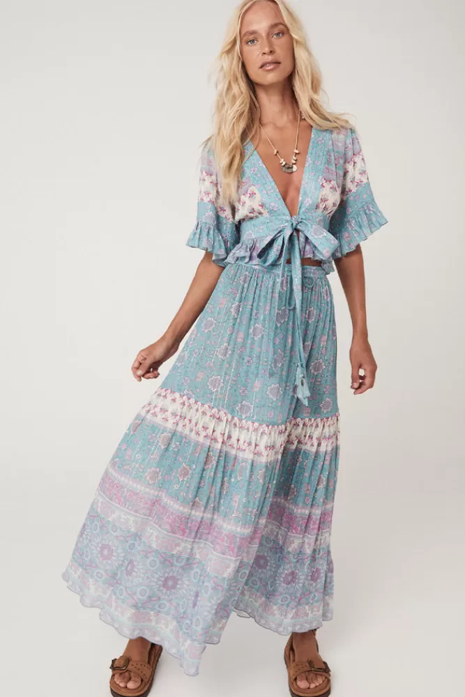 Our Lovers Beach Maxi Skirt In Paradise Exudes Island Goddess Glamour. Our Usual Skirt Shape With Some Updates, Our Skirt Has Minimal Volume At The Hip For A Flattering Silhouette That Then Cascades To The Floor With A Single Tier Adding Movement And Drama. Arriving Without Lining, Our Skirt Is Intentionally Sheer However The Metallic Thread And Intricate Hand Drawn Lovers Beach Print Offers The Wearer Some Added Modesty. We Imagine This One Paired With Your Favourite Spell Tee And Combat Boots For A Cool Girl Twist Or With Our Lovers Beach Tie Blouse, Tan Mules And A Chunky Necklace For A More Elevated Take. – Crafted With 49% Organic Cotton 48% Lenzing Viscose 3% Metallic- Elasticated Waist- Adjustable Rope Waist Tie With Tassels And Custom Charm- Spell Exclusive