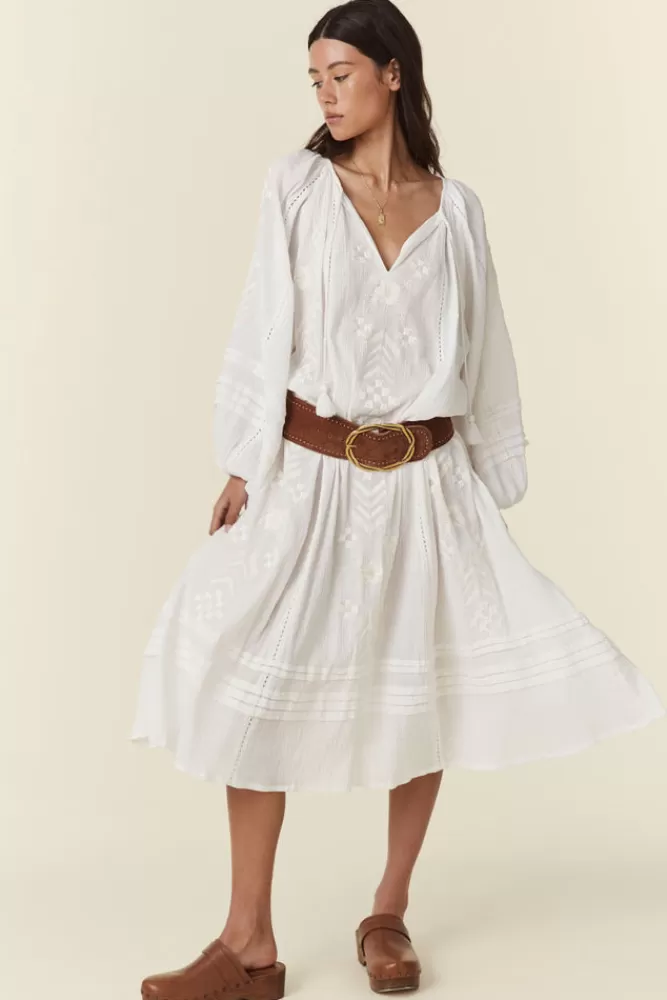The Sandbar Gown In White Is Dreamy And Elegant, An Ode To The 70’S Muse. Understated With Intricate Detail Our Gown Features Stunning Custom Embroidery, Ties And Tassels At The Neck And Inserted Trim And Pleats Throughout. Dramatic Billowing Sleeves And A Flowing Generous Fit Flatter The Figure And Add A Touch Of Otherworldly Opulence. For A Little Bohemian Goddess, Add Cowboy Boots And A Headscarf; Or For Vacay Styling We Recommend A Tan Mule And Gold Hoops. Timeless And Endlessly Versatile, This Piece Is An Easy Throw On For Elevated Styling For Any Occasion. – Crafted With 100% Organic Cotton- Elastic Cuffs- Unlined For Easy Wear